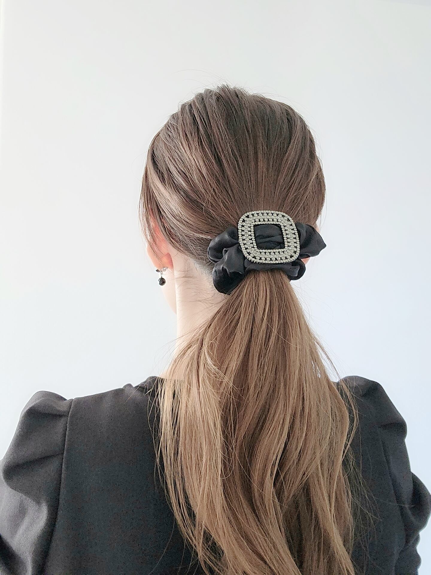 日常使いにはもちろん、パーティーやウェディングのヘアアレンジにもぴったりです。光沢感のある黒いシュシュも、上品な印象で大人可愛い装いを表現できます。