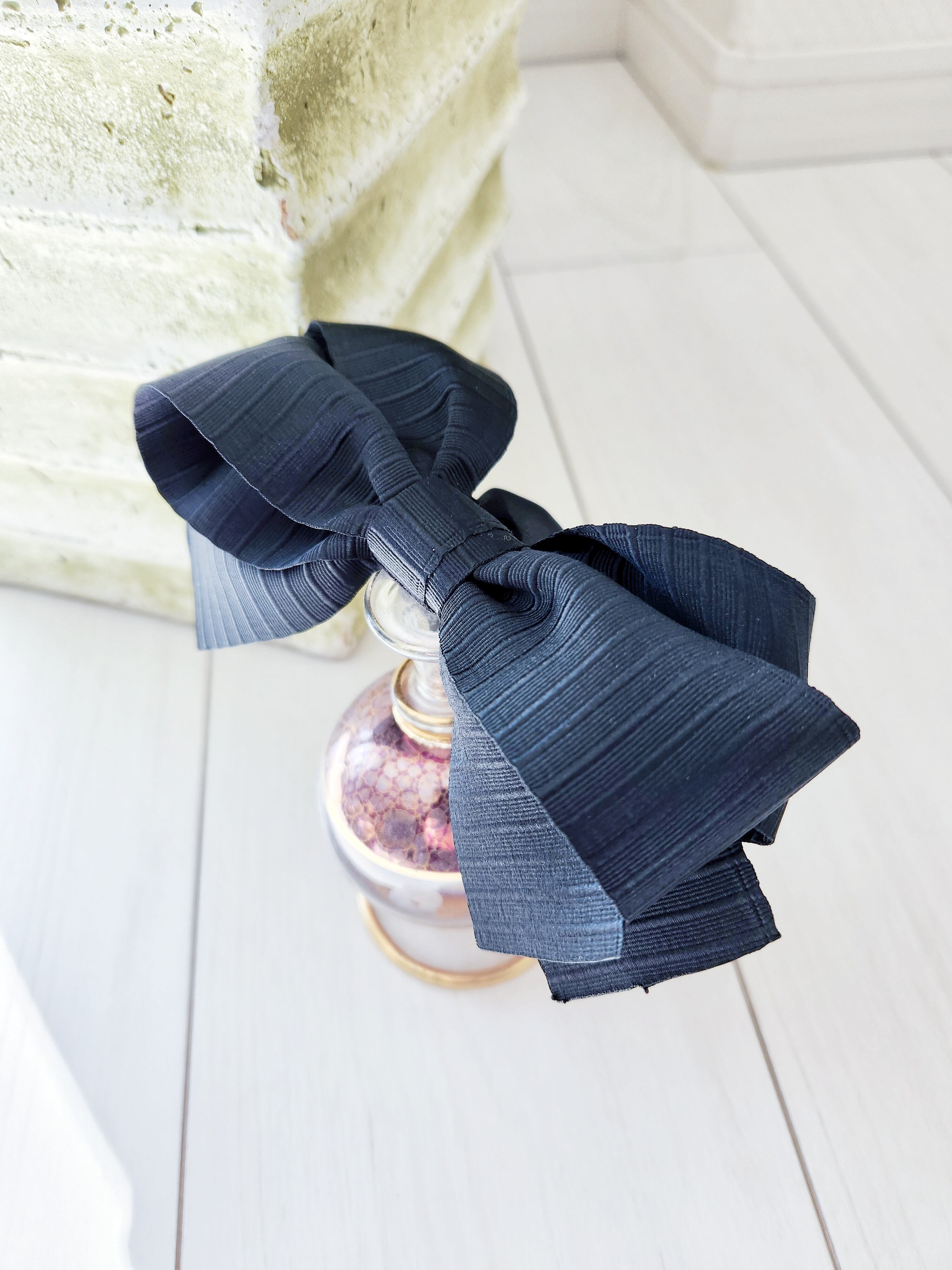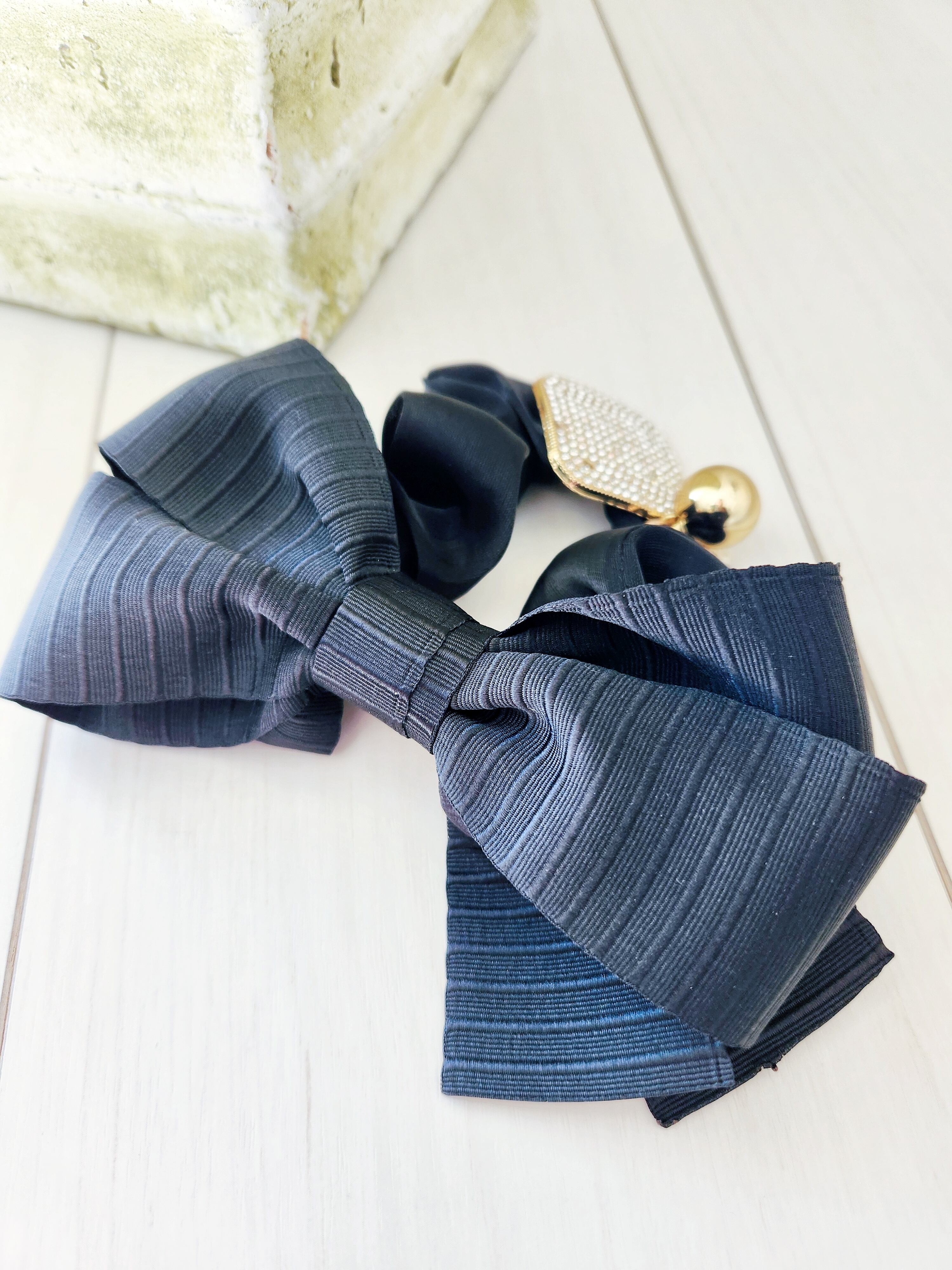 リボンシュシュ(キラキラチャームつき)は、可愛らしいデザインが特徴のアクセサリーです。リボンの形が大きめで存在感があり、華やかさをプラスしてくれます。さらに、キラキラと輝くチャームがついているので、より一層のオシャレ感を演出してくれます。